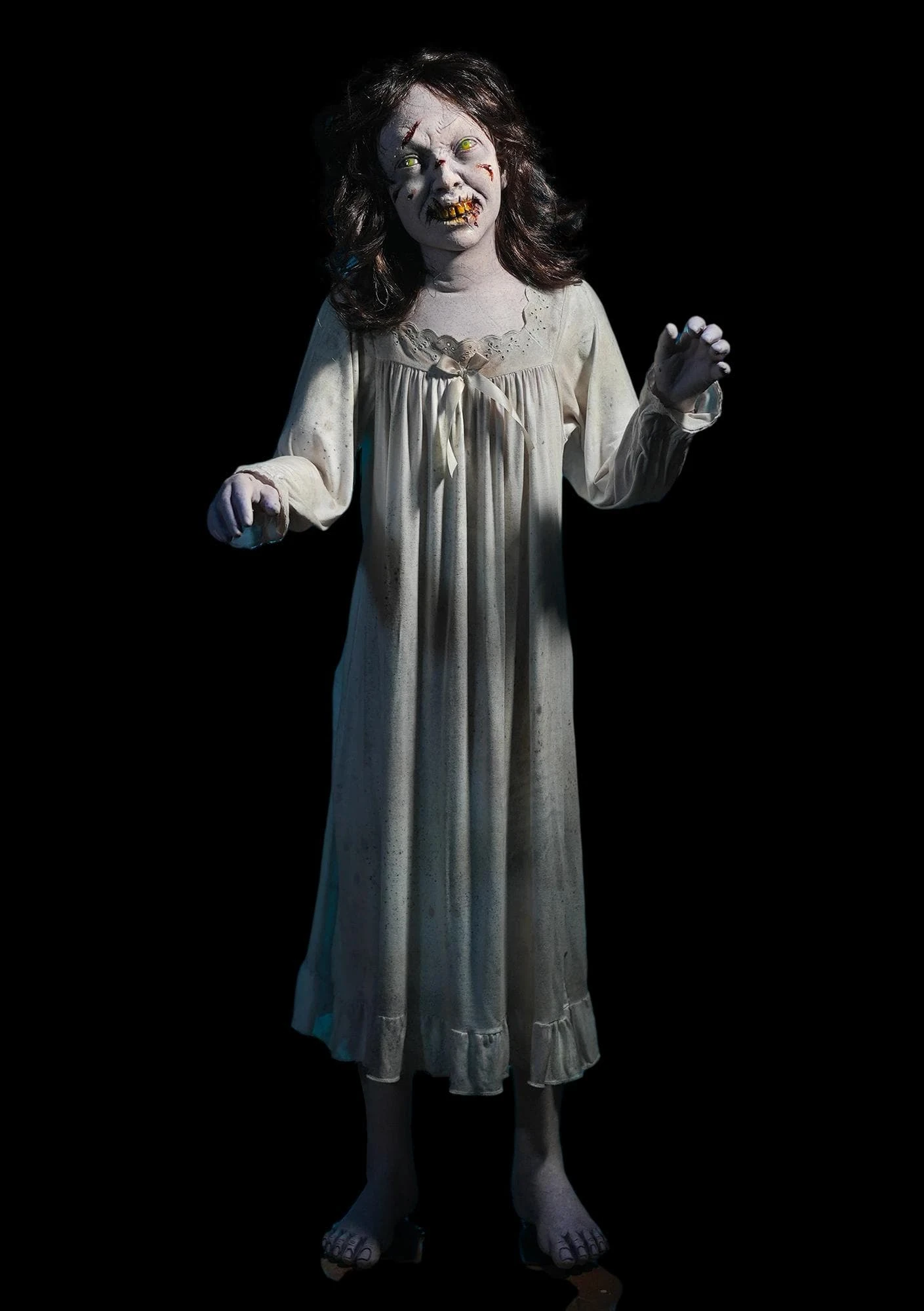 Affliction is a 4.5 ft. tall standing Halloween prop is an amazingly eerie demon-possessed girl with a disturbing smile. Crafted of latex, armature and foam-filled, this is a perfect static prop for your yard haunt, home Halloween decorating, haunted house, or scary scene.Â