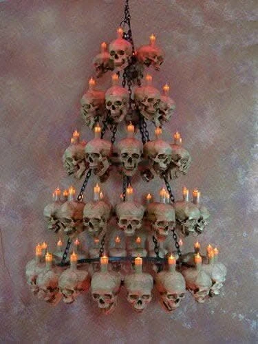 This elaborate well constructed Life-Size skull chandelier, made with 60 life-size skulls, is sure to overwhelm any one that enters your haunted house. Some of the skulls have the jaws open in horror, some closed and some with no jaws at all.