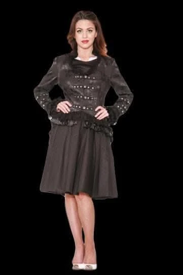 Our stunning jacket is made from a luxurious brocade fabric and features a scooped V-neck collar with with lace trim.Military style metal button detail on the front and sleeves.Bell sleeves with lace and ruffle trim.The back of the coat has a criss-cross lace up style with long coat tail with lace ruffle trim.Â