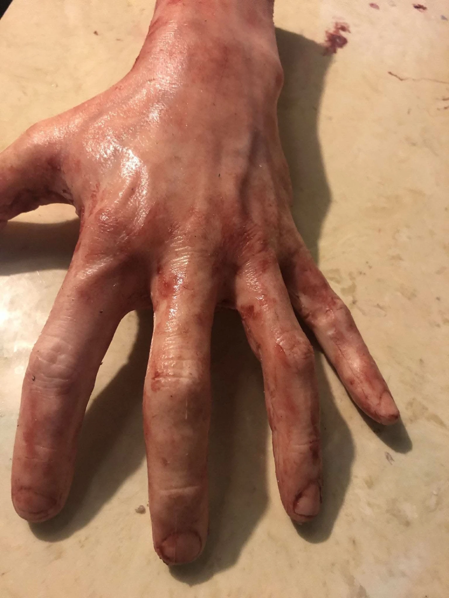 This Severed male hand  is skinned in silicone and foam filled. There are minor seam lines as shown In Pics. This is a cheaper version of the solid silicone parts. A perfect addition to your haunt or film set.