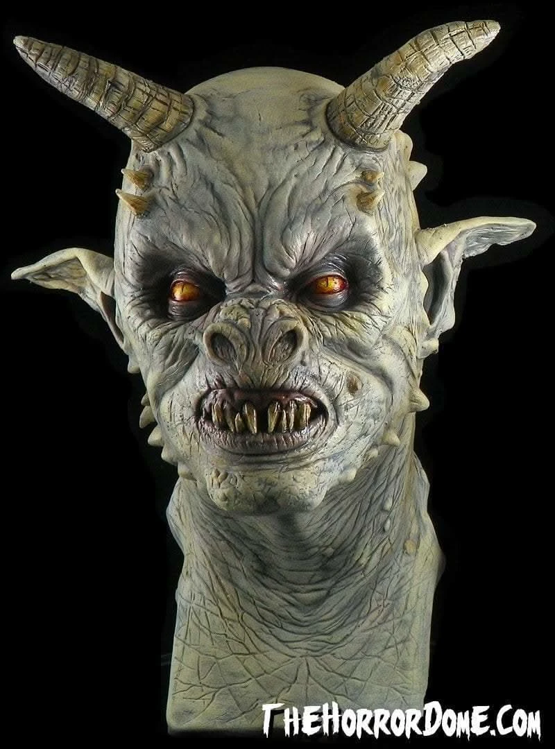 Originally sculpted to protect against evil spirits, this unholy Gargoyle was cursed and struck by lightning. Now, he stalks the land in search of his next victim. With devilish horns, an upturned, menacing snout for sniffing out his prey, piercing, golden eyes that show neither restraint, nor remorse, and thick leathery skin that is impenetrable to anything less than the sharpest sword of spear, he’s a perfectly designed killing machine. Mutilated sheep and cattle are only the beginning. Soon, he will develop a taste for human meat. The Gargoyle Halloween mask will be part of a bone-chilling costume and make a unique addition to your collection of ghastly goods. Expertly detailed by inspired artists at The Horror Dome, this over the head design will give the neighborhood trick or treaters nightmares for years to come. Be the star of the next costume party, or put a professional touch on your amateur monster movie with this hand painted mask.