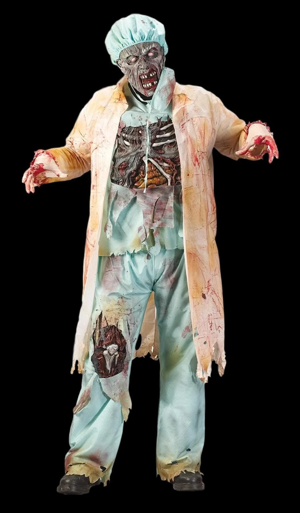 Shirt with fully detailed, rotted chest attached, pants with rotted knee exposed, rotting zombie mask, surgical mask, cap and latex gloves. Standard Adult size fits 140-200lbs. Polyester, cotton, pvc, latex rubber. Coat not included.
